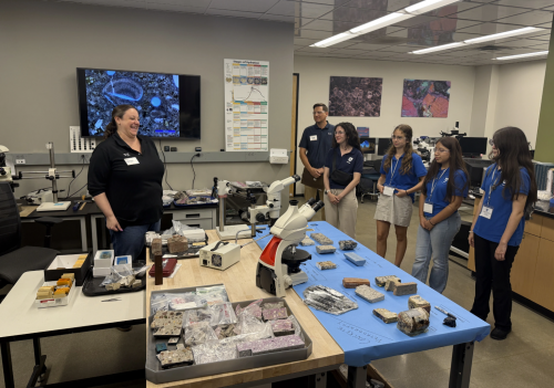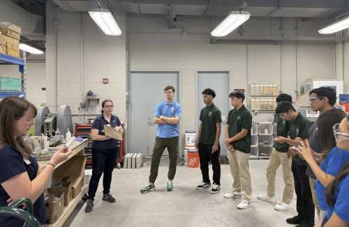Materials engineer Elizabeth Wagner welcomed everyone to the concrete lab, where she explained that her colleagues were engaged in understanding how to make the strongest, most durable concrete for projects. Students handled materials that could be mixed into concrete, such as gypsum and fly ash. Then, petrographer Corrie Piehowski showed students the Thermotron and explained how it can simulate environmental exposure for materials before she led the students through other areas.