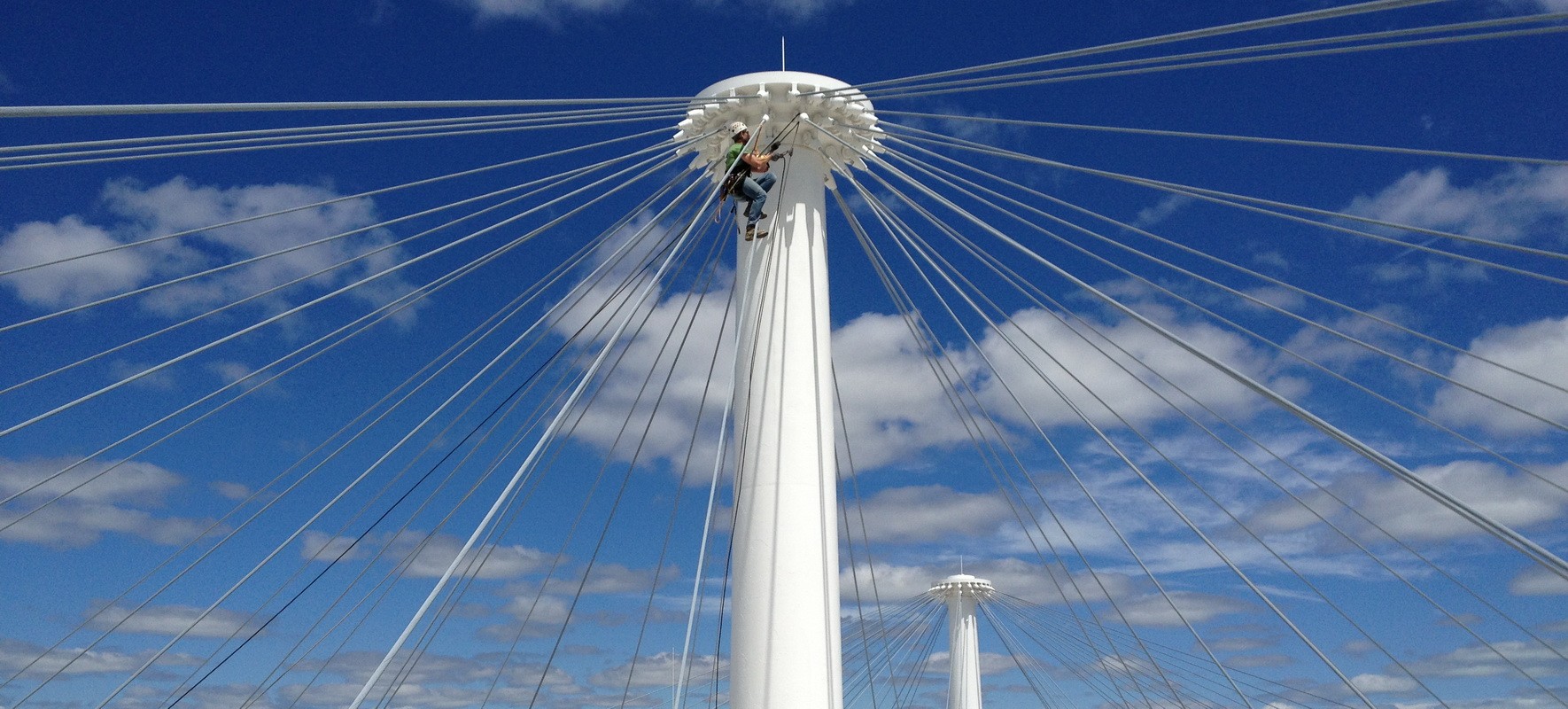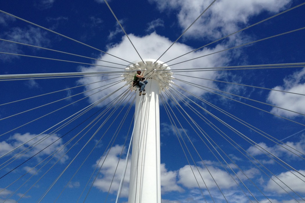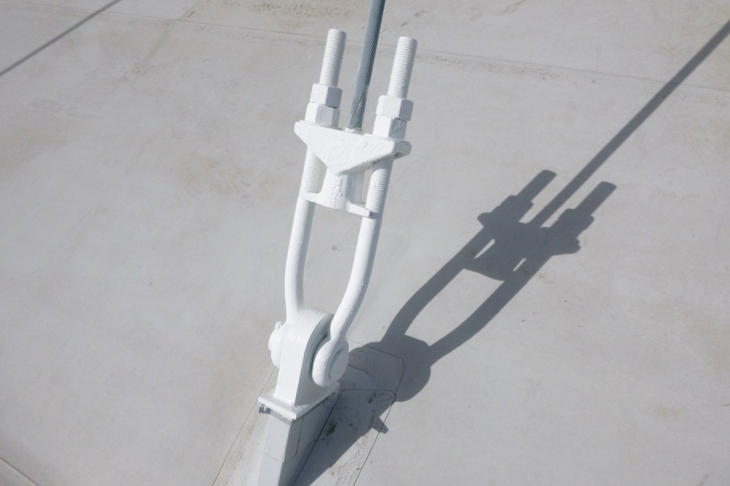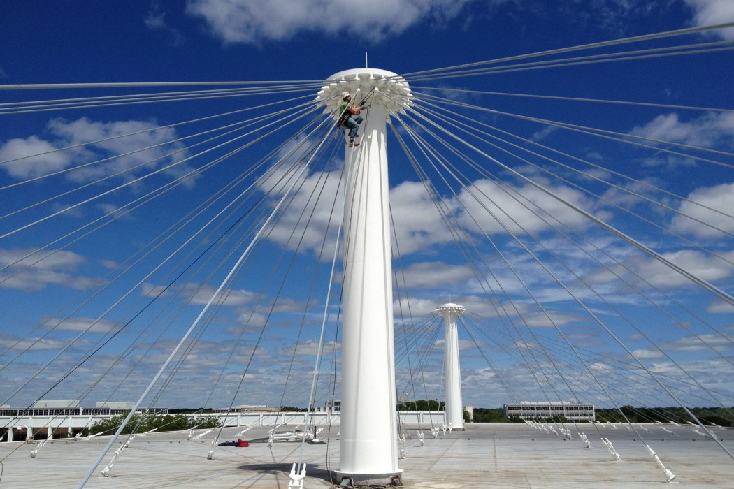 The level of corrosion did not pose a structural concern. However, since these cables serve as the primary structural support for the roof, WJE recommended a more frequent inspection cycle to establish the rate of progression of the corrosion on the cables. To avoid the expense of constructing scaffolding around the cables to facilitate access for inspections, WJE was retained to utilize industrial rope access techniques to access the tops of the masts and to inspect the lengths of the cables and their anchorages. Climbing, rappelling, and ascending were utilized to provide arms-length inspection of the cable anchorages at the tops of the masts as well as at an assortment of cables during each inspection.