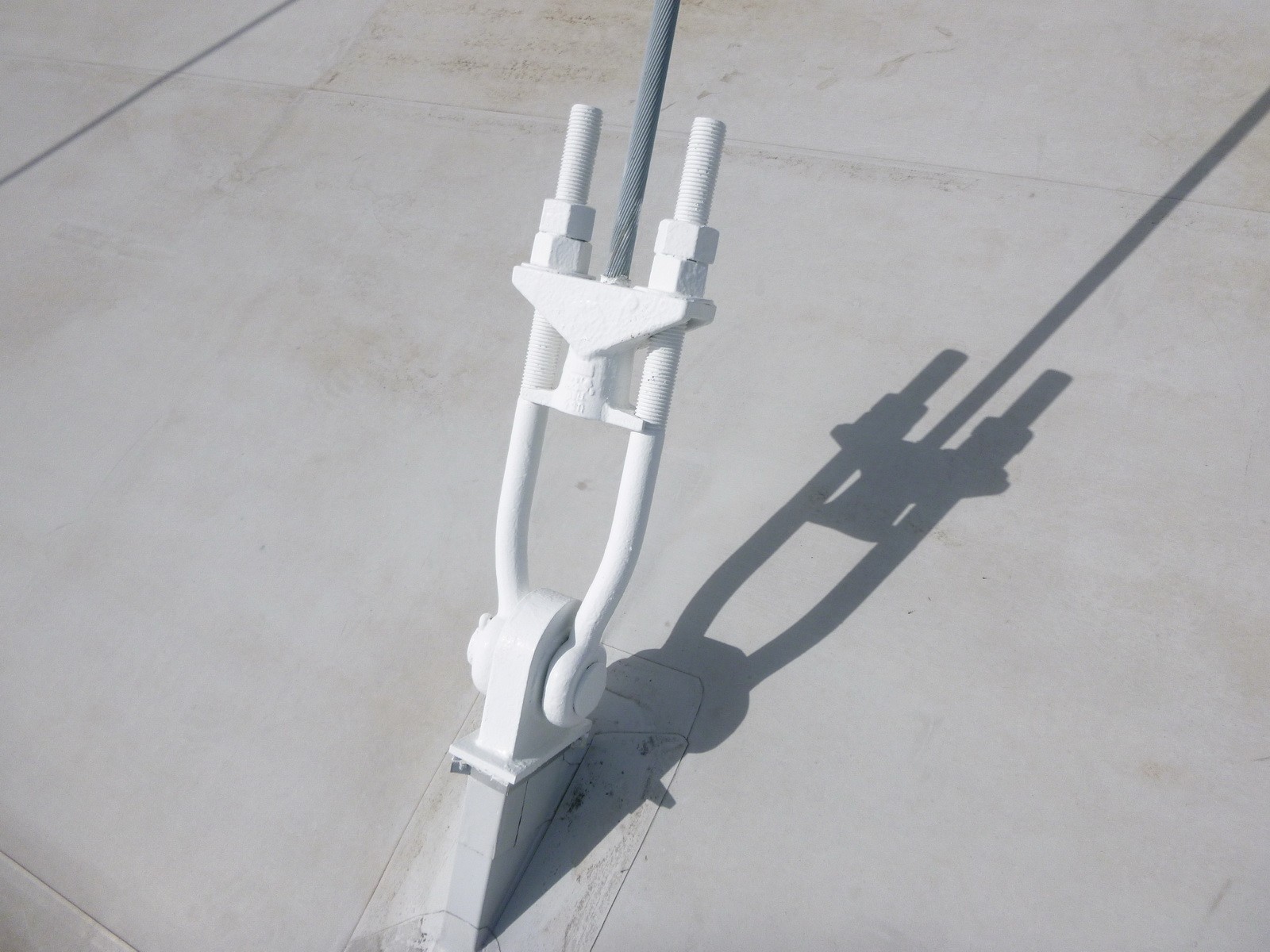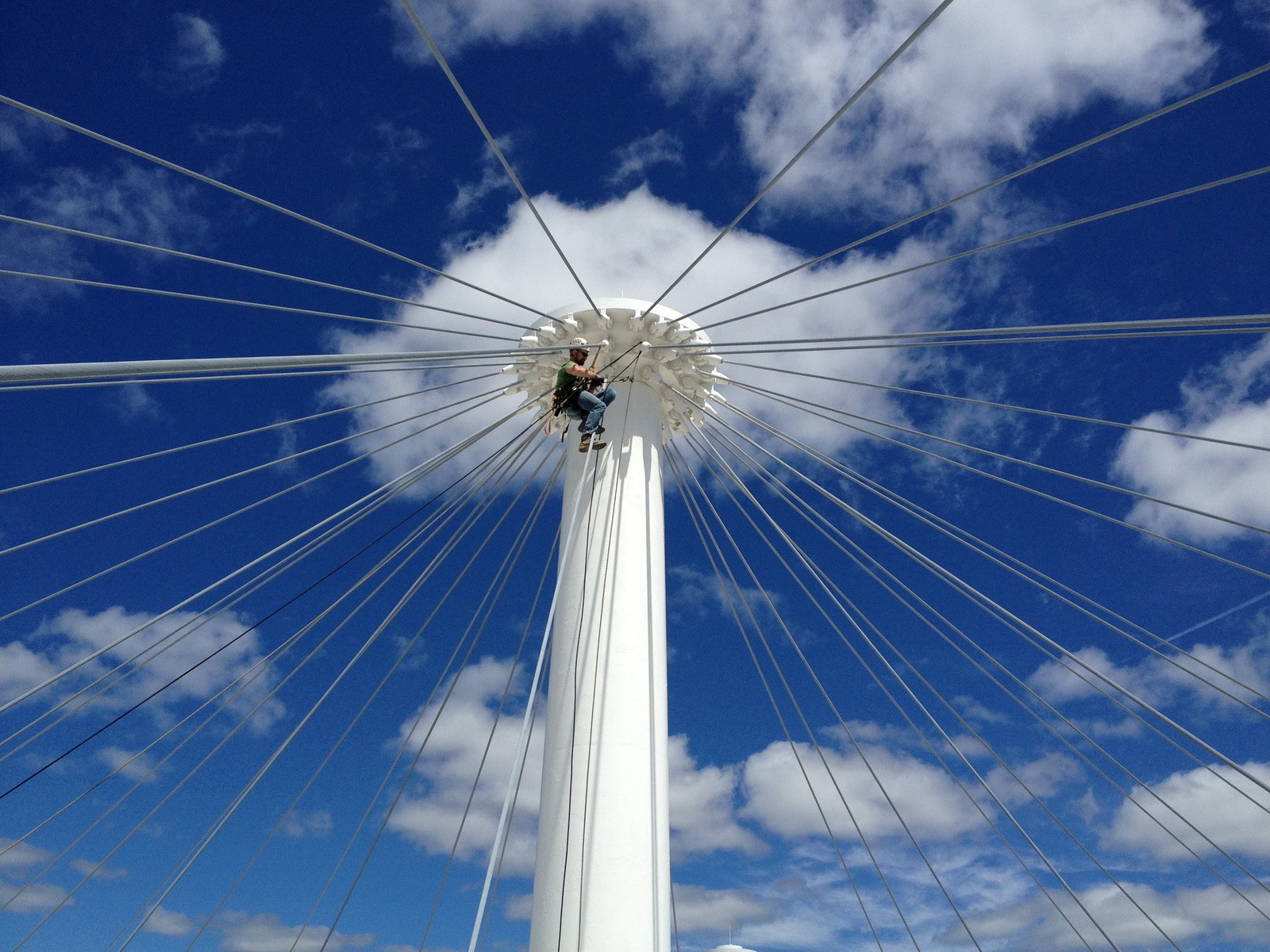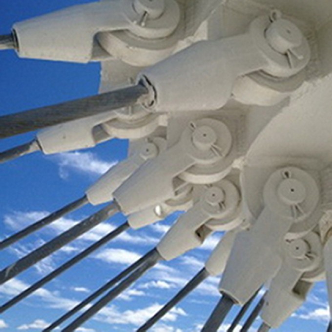 The level of corrosion did not pose a structural concern. However, since these cables serve as the primary structural support for the roof, WJE recommended a more frequent inspection cycle to establish the rate of progression of the corrosion on the cables. To avoid the expense of constructing scaffolding around the cables to facilitate access for inspections, WJE was retained to utilize industrial rope access techniques to access the tops of the masts and to inspect the lengths of the cables and their anchorages. Climbing, rappelling, and ascending were utilized to provide arms-length inspection of the cable anchorages at the tops of the masts as well as at an assortment of cables during each inspection.
