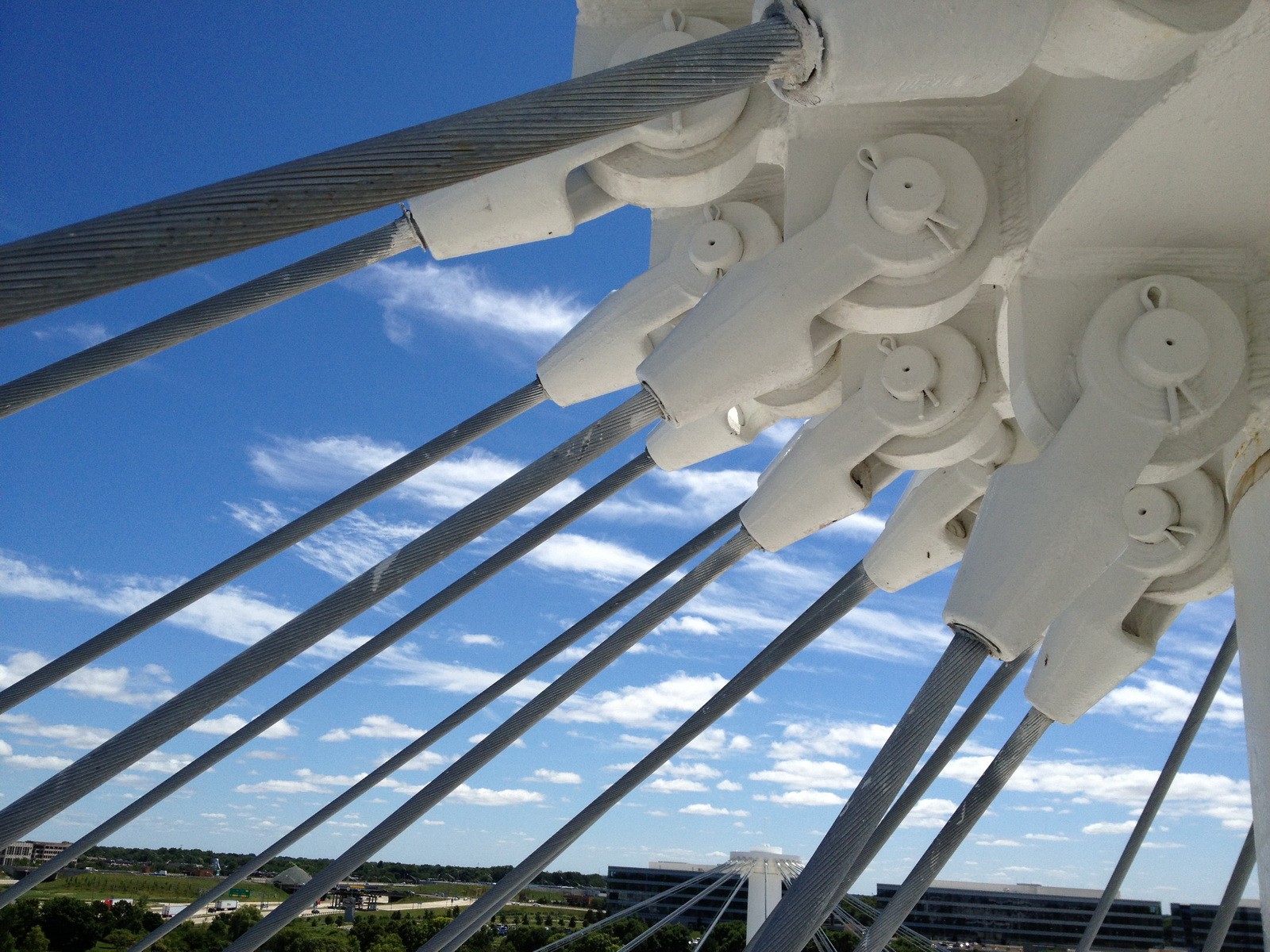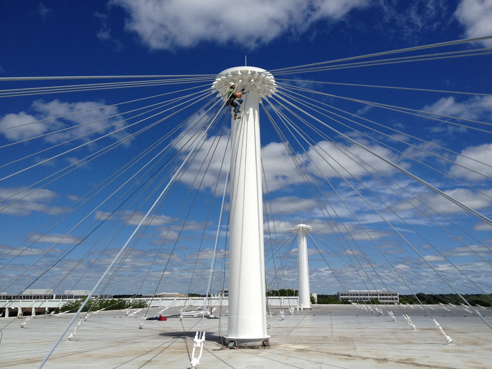 The campus of buildings was constructed circa 1973. The roof framing of one building consists of a grid of structural steel wide flange beams with continuous, fully welded end connections. The beams are suspended from a series of galvanized steel cable stays, which are anchored to two large vertical masts that extend approximately 36 feet above the roof. Forty-eight 1-1/4-inch diameter cables extend radially from the top of each mast anchorage attached to the top of the roof framing. Twenty-four 3/4-inch diameter cables extend from the underside of the roof framing to an intermediate anchorage on each mast, providing lateral stability and resistance to wind uplift forces.