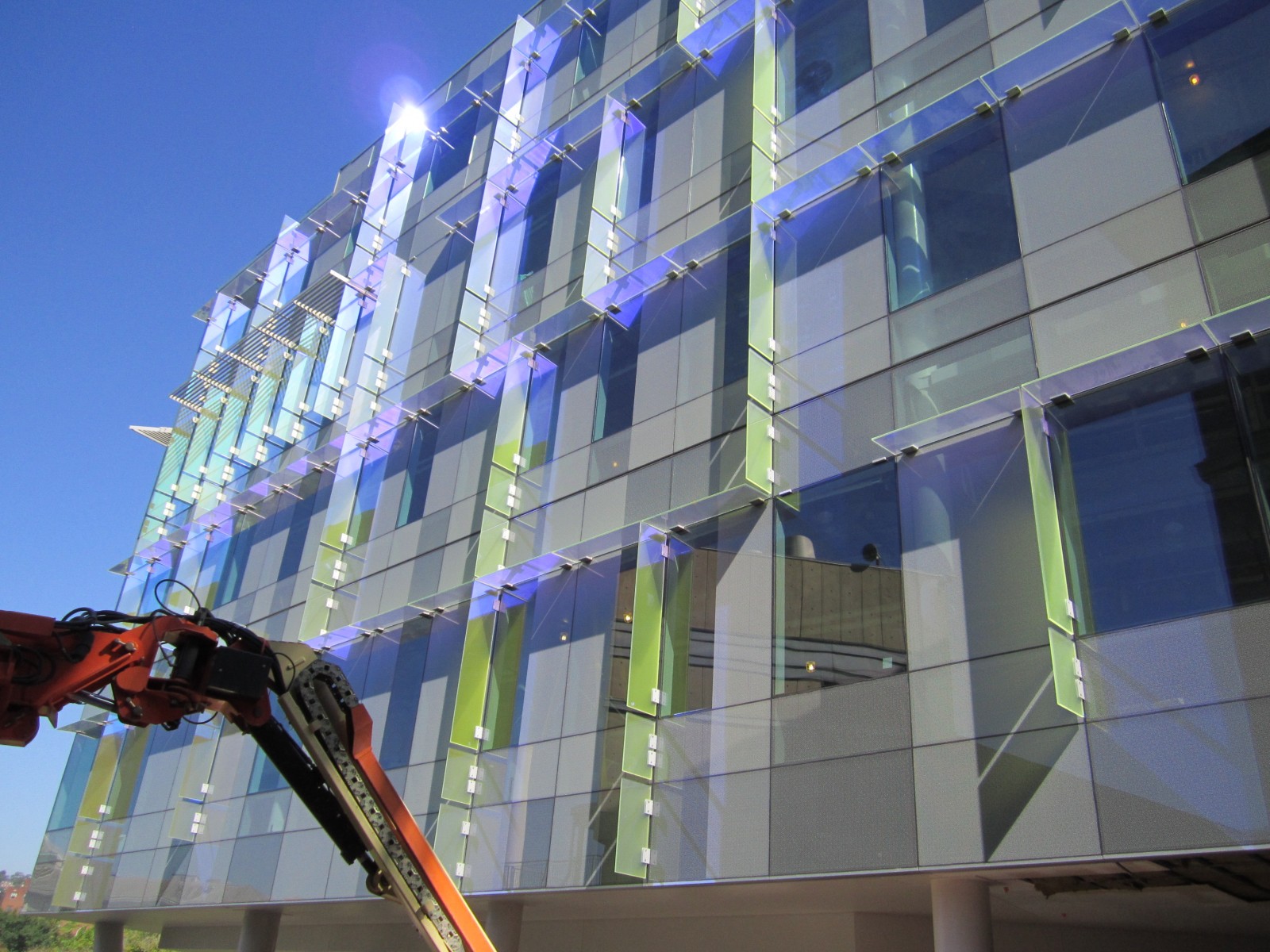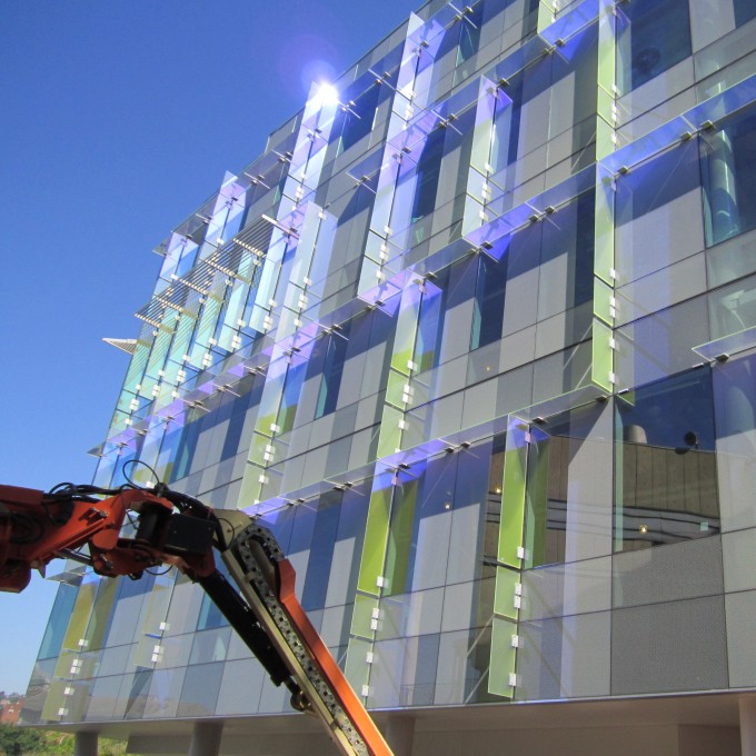 WJE served as a part of the building enclosure commissioning team retained by Carnegie Mellon University (CMU). WJE efforts were focused on the exterior envelope systems to prevent air leakage through and water penetration into the building. The unitized curtain wall in the new building was a unique design consisting of dichroic glass fins resulting in nontraditional detailing.