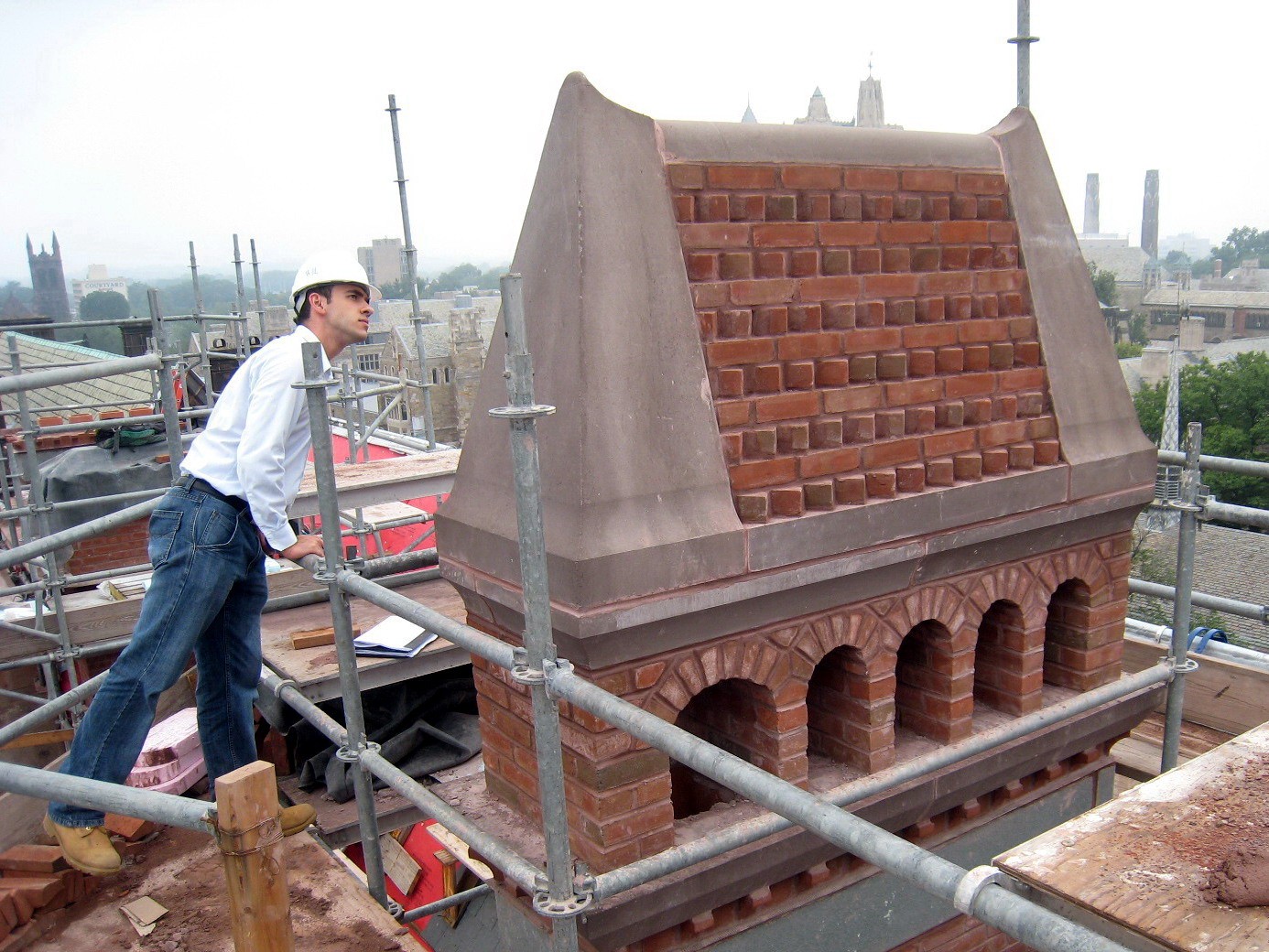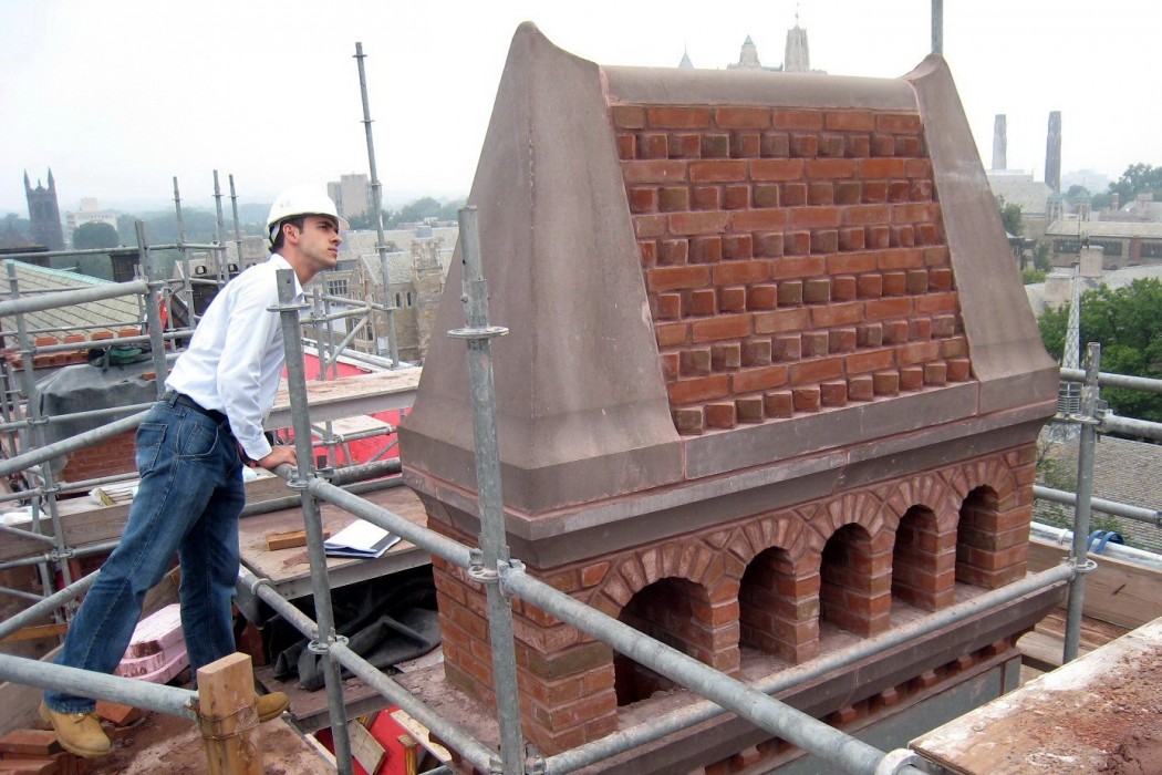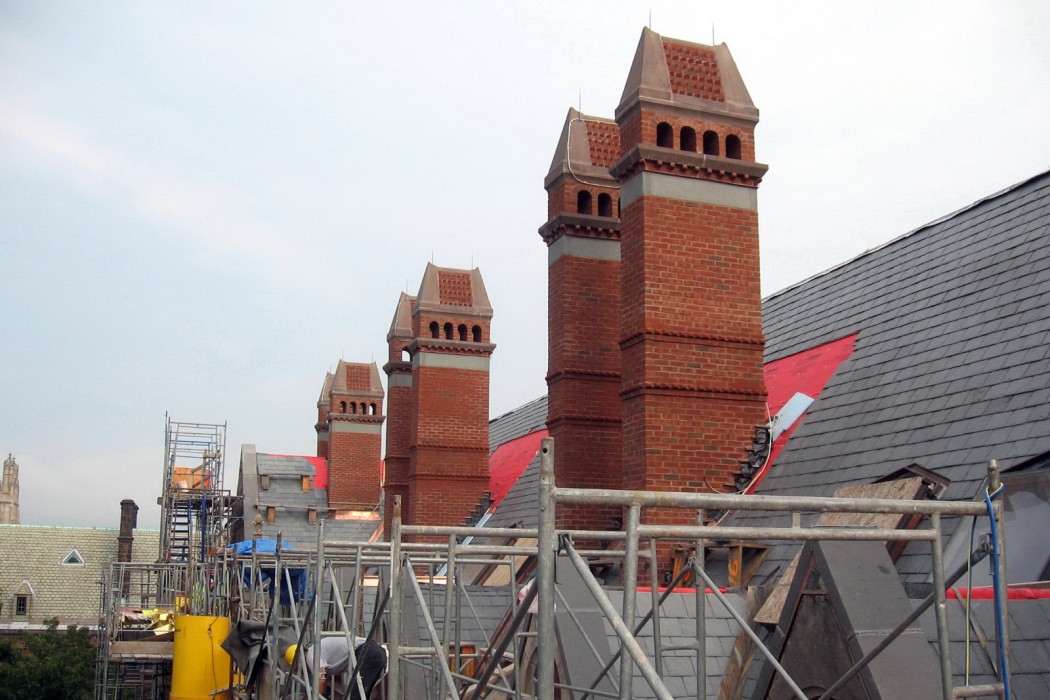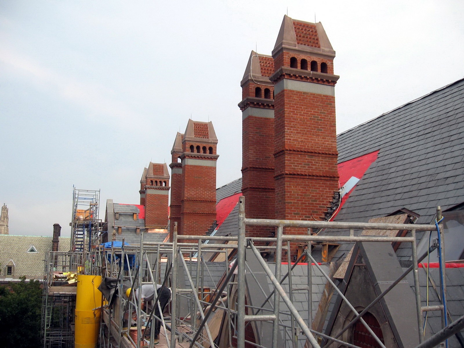 From WJE's condition assessment, a design restoration program was developed that detailed the complete reconstruction of the turrets and chimneys, replacement of the slate roofing and copper flashing, brownstone repairs, and window replacement due to extensive damage caused by years of exposure to harsh New England weather conditions. The project was phased over summer seasons in order for building to remain functional as a dormitory for Yale University.