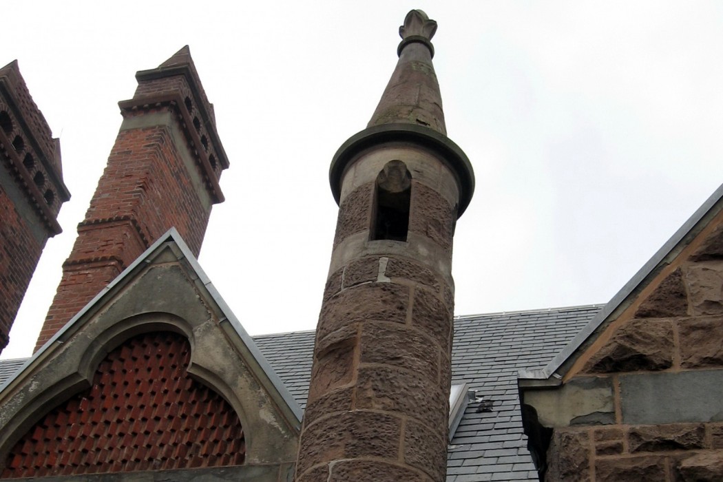 Durfee Hall is the first stone dormitory constructed on the campus of Yale University. When completed in 1871, it was regarded as a high point in Victorian Gothic style architecture. "It will be a long time before the quiet dignity of its roof and chimneys will be surpassed anywhere." wrote American Architect and Building News. The building facades are predominately split face, New Jersey Sandstone. North River Bluestone and buff colored Ohio Sandstone accentuate the facades at the copings, stringcourses, and ornamental trim. Sandstone turrets flank gables located at each end of the building and massive brick chimneys rise above the slate roofing.