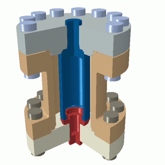 The laboratory-scale pressure vessel is used to perform high-pressure, high-temperature testing on well cement slurries. The cylindrical pressure vessel design has flanged and bolted end closures with multiple high-temperature metal seals. The unique design includes two concentric pressure chambers to allow for cement in the annular space to be functionally tested under applicable confinement and directional loading.