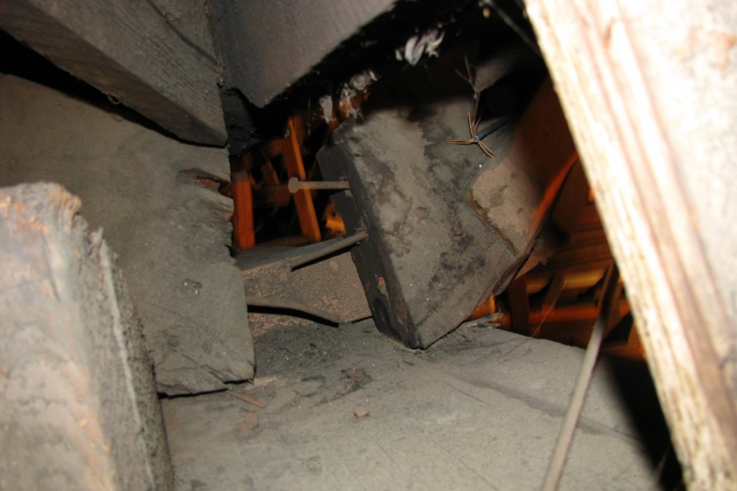 WJE performed close-up observations from the underside of the ceiling, revealing several separations between ceiling arch members at the peak, loose and missing ornamental millwork pieces, and sagging of the arch system around the center medallion. Observations of the roof surface and roof structure within the attic revealed significant deflection and distress as well as damage to the ceiling structure. Structural analysis of the roof trusses showed deficiencies in their ability to support the existing and anticipated loads. WJE developed structural repairs and procedures for the roof trusses and ceiling structure, which included the addition of thirty-four tie rods (thirty of which were hidden above the ceiling). When portions of the masonry walls were removed to install the new truss tie-rods, several severely decayed truss support columns, which were embedded in the masonry walls, were discovered.