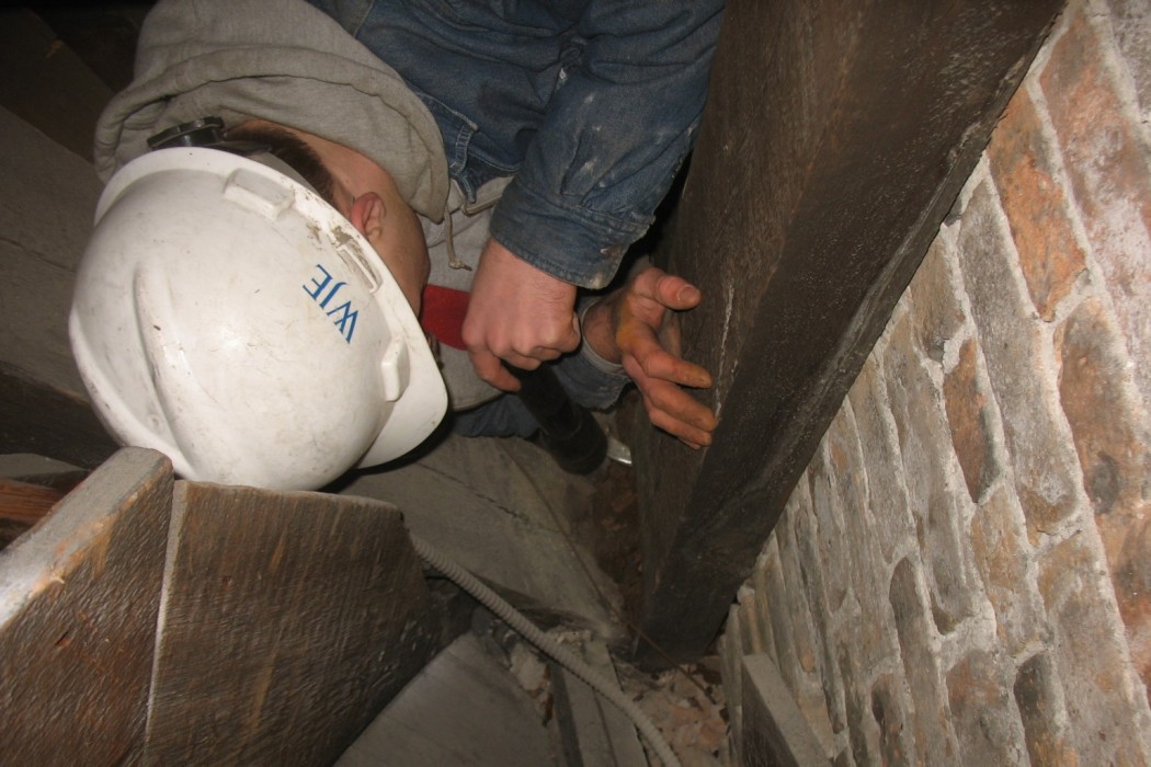 Replacement of columns was not feasible due to the cost of shoring and damage that would occur to the historic decorative wood ceiling. Therefore, WJE developed a repair where the decayed wood columns were injected with epoxy and externally reinforced with steel. To reduce the potential for future problems related to moisture intrusion and condensation, WJE also developed repairs that locally transformed the exterior mass walls around the columns from a barrier to a drainage wall system.