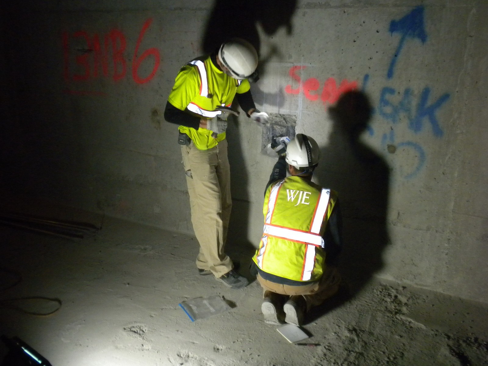 The visual inspection and acoustic sounding surveys allowed WJE to focus the nondestructive testing and inspection openings on areas of the bridges that exhibited conditions indicative of post-tensioning distress. After identifying the areas of potential concern (cracks, spalls, and delaminations), WJE installed drill-hole and large inspection openings. The drill-hole openings allowed for documentation of conditions inside the ducts. The large inspection openings allowed for duct interior observations as well as grout sampling. The inspection openings identified grout voids and prestressing strand corrosion. Grout and concrete materials testing did not identify any deleterious activities.