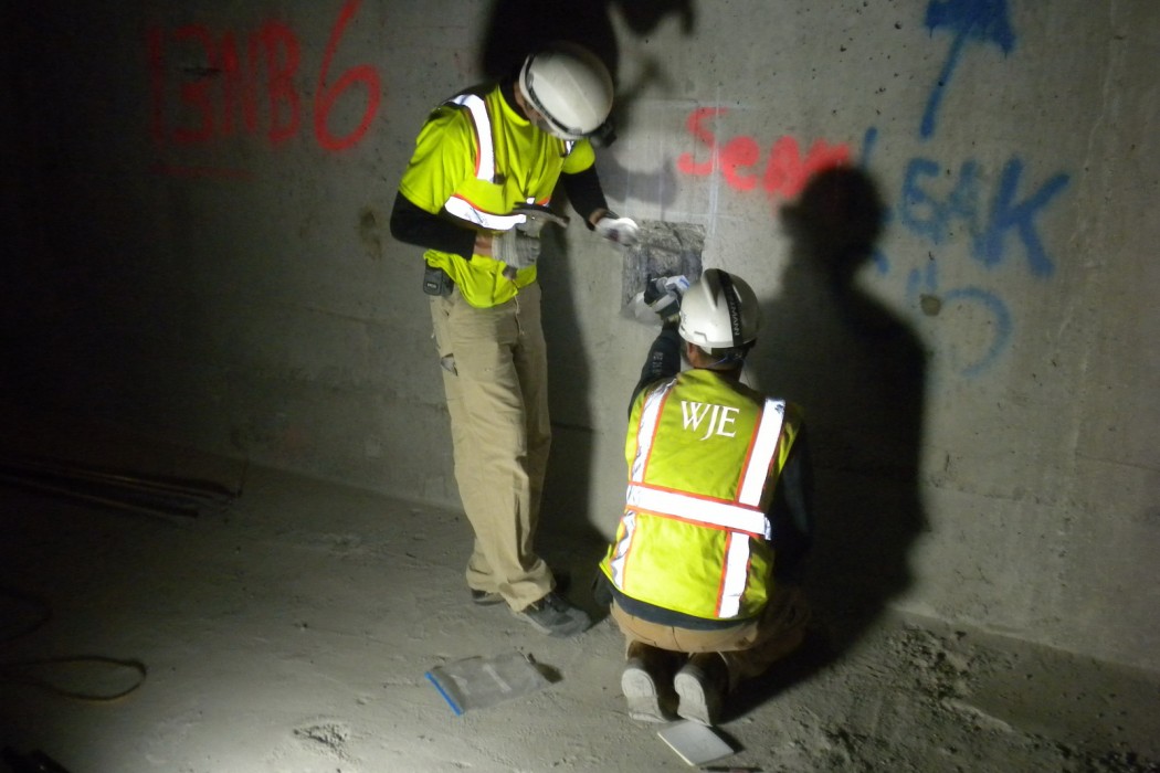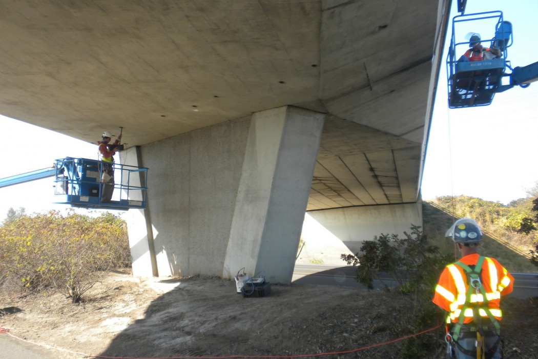 WJE performed all inspection work from the inside of the box girders. This work included a limited visual inspection and acoustic sounding of the concrete, half-cell potential measurements, locating post-tensioning ducts using ground penetrating radar (GPR), installation of inspection openings, and materials testing of the concrete and grout.