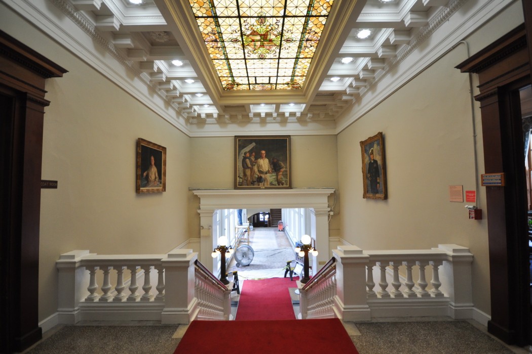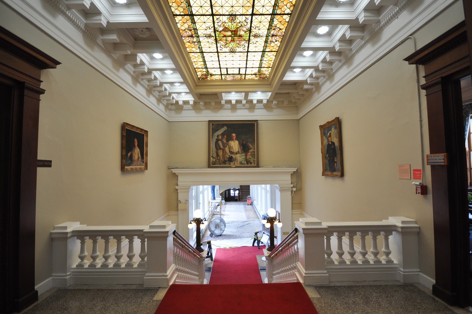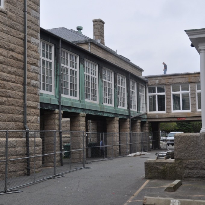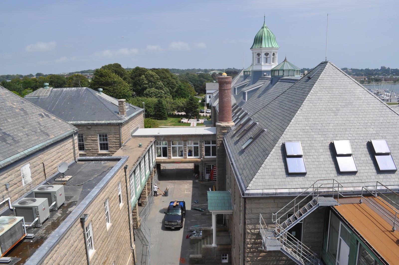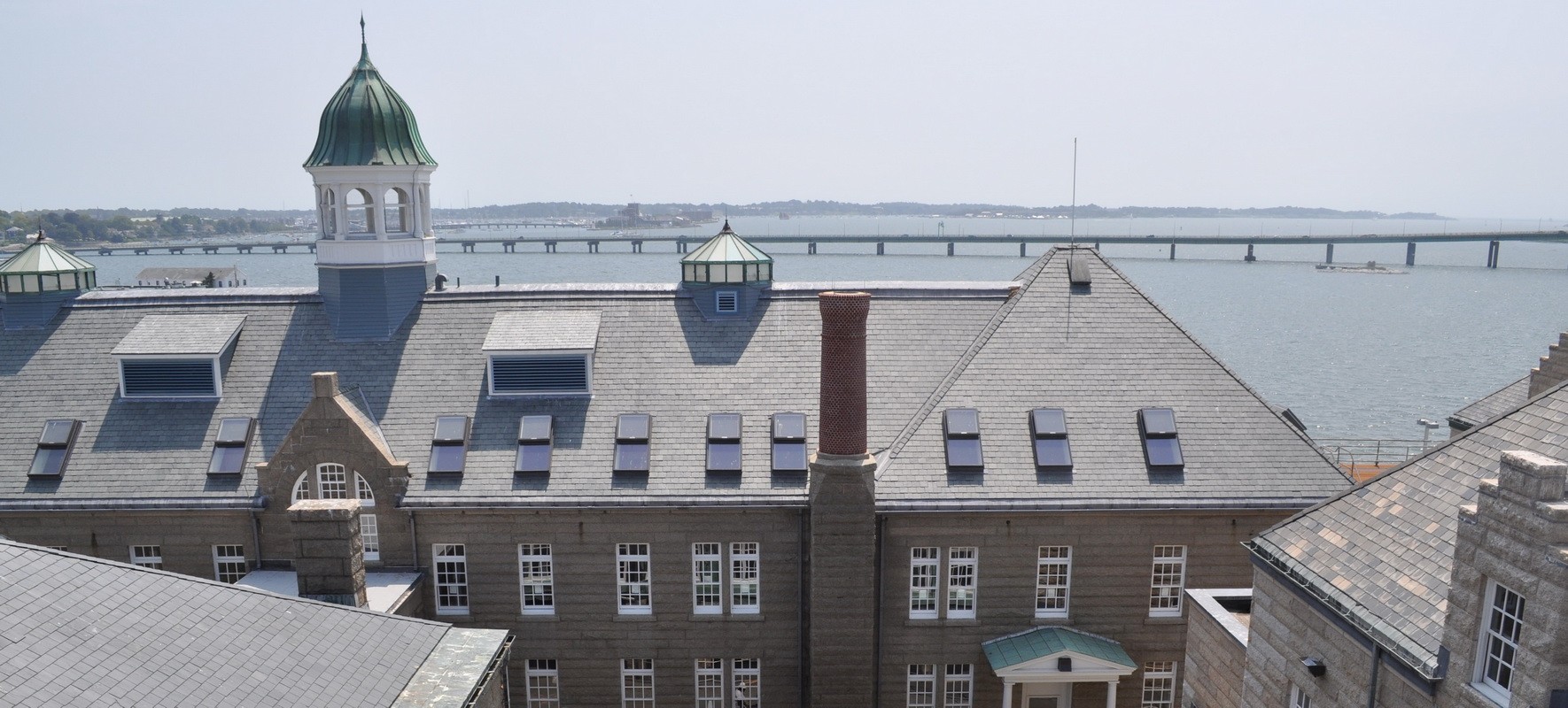 WJE was retained as a consultant to an architect-led team to assess the condition of the exterior enclosure. This included flat roofs, slate, and copper flashing; exterior granite facades; and wood operable windows and doors. On the interior, WJE performed analyses on various plaster surfaces, including scagliola columns in the Mahan Rotunda. Findings as well as recommendations for the preservation or rehabilitation of the enclosure materials and assemblies were summarized in a report along with cost estimates that were developed by others. NAVFAC intends to use the report for budgetary planning of a comprehensive modernization and rehabilitation program.