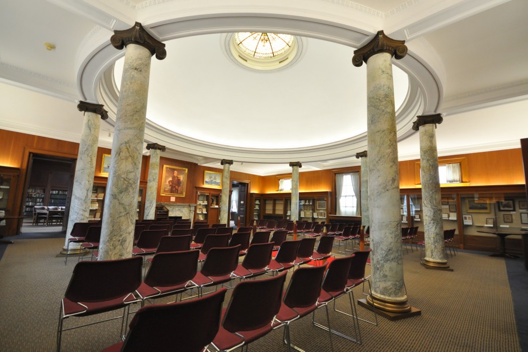 Mahan Hall, named for Rear Admiral Alfred Thayer Mahan, was opened in 1904 and encompasses the historic Mahan Rotunda and Reading Room. Additions, including library stacks, were completed in 1934 and 1965. Pringle Hall, named for Vice Admiral Joel R. P. Pringle, was opened in 1934 and was the principal site for war gaming until the Naval Electronic Warfare Simulator was built in Sims Hall in 1957. Pringle Hall contains a 432-seat auditorium, the Quinn Lecture Room, the Naval Staff College, and the Naval War College Press. Both buildings are National Historic Landmarks with facades of Milford pink granite and wood windows, and each have roofs of slate with copper flashing.