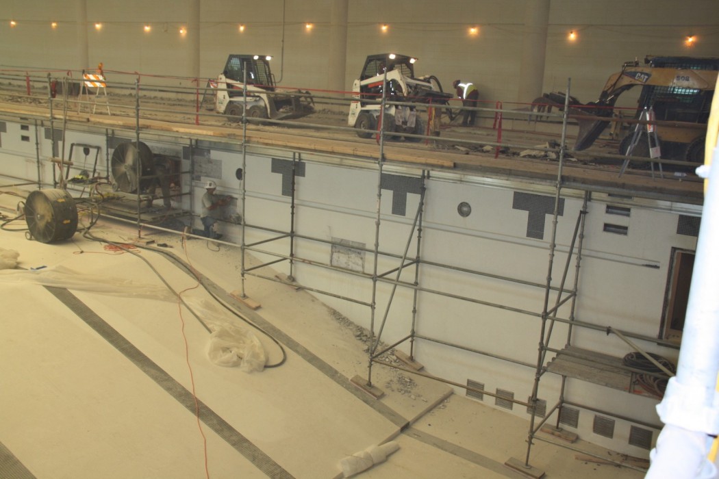 The tiles, mortar setting bed, and waterproofing membrane were removed to expose the structural deck slab. Repairs were made to delaminated areas found on its top and underside. A new waterproofing membrane, grounding, linear floor drains, and concrete topping were then installed to provide the slope for the finished floor. Delaminated tiled areas on the pool's bottom and walls were repaired with new tiles set in mortar bedding. The three underwater windows, existing lights, and speakers were removed. Their cavities were then enclosed with cast-in-place concrete and tiled.