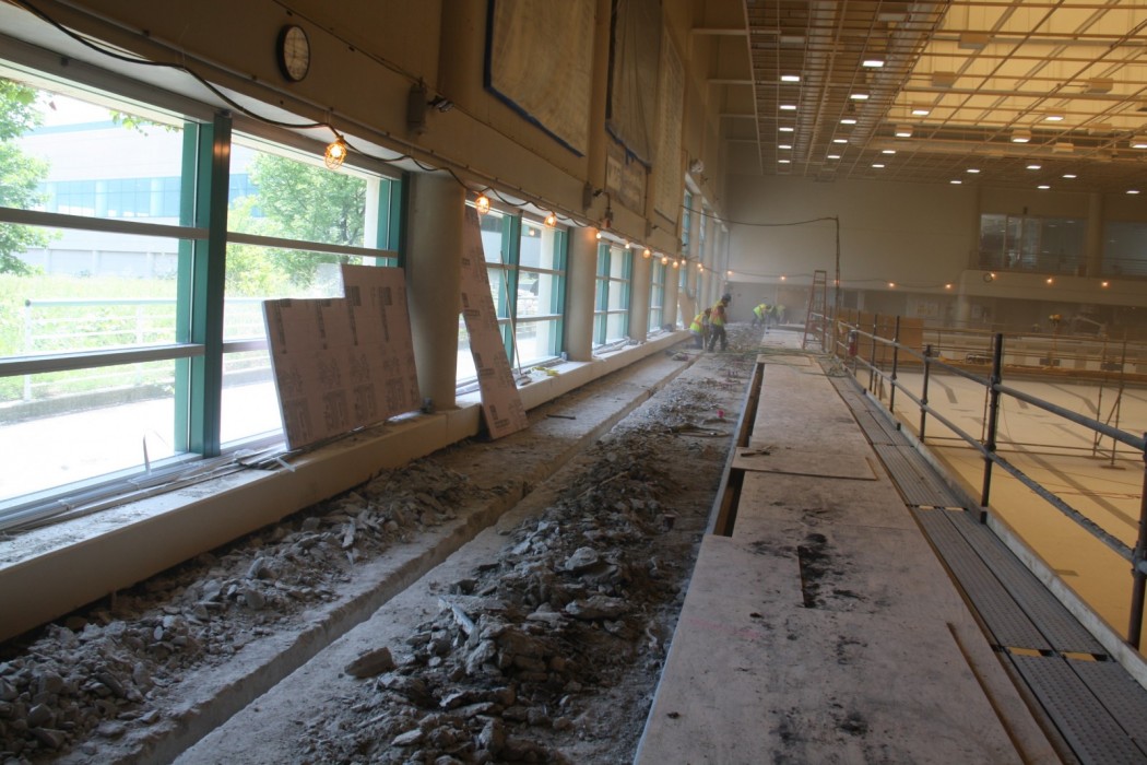 Additional improvements to the pool space included replacing the existing steel doors and door frames with stainless steel and installing new aluminum doors. WJE also replaced the sealant on the exterior walls, restored the bleachers, and installed additional pool ladders and an ADA lift.