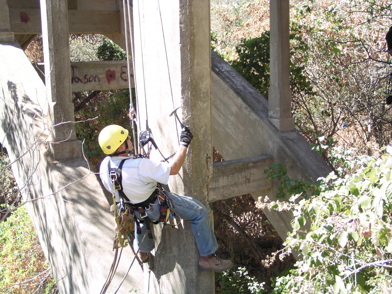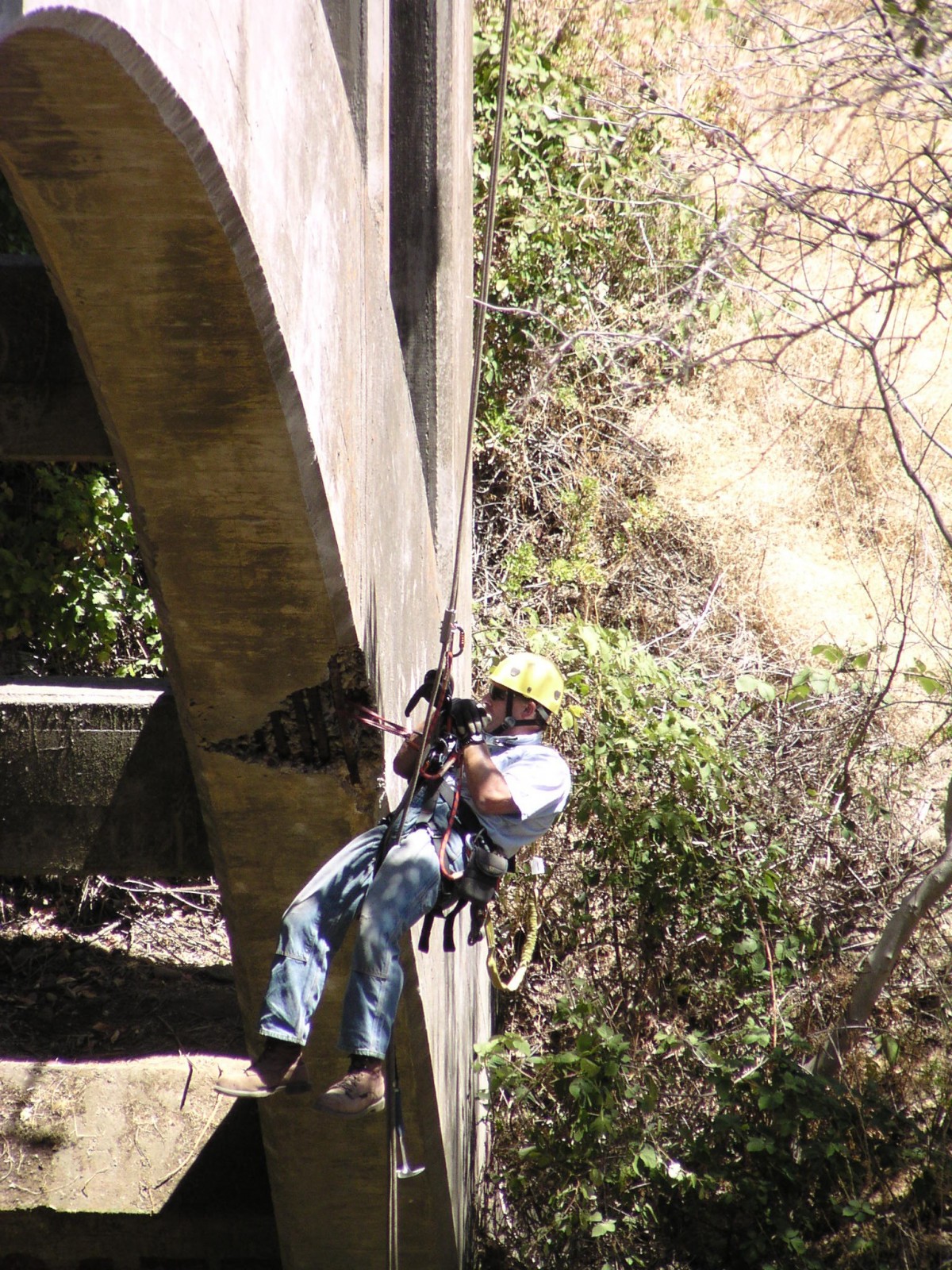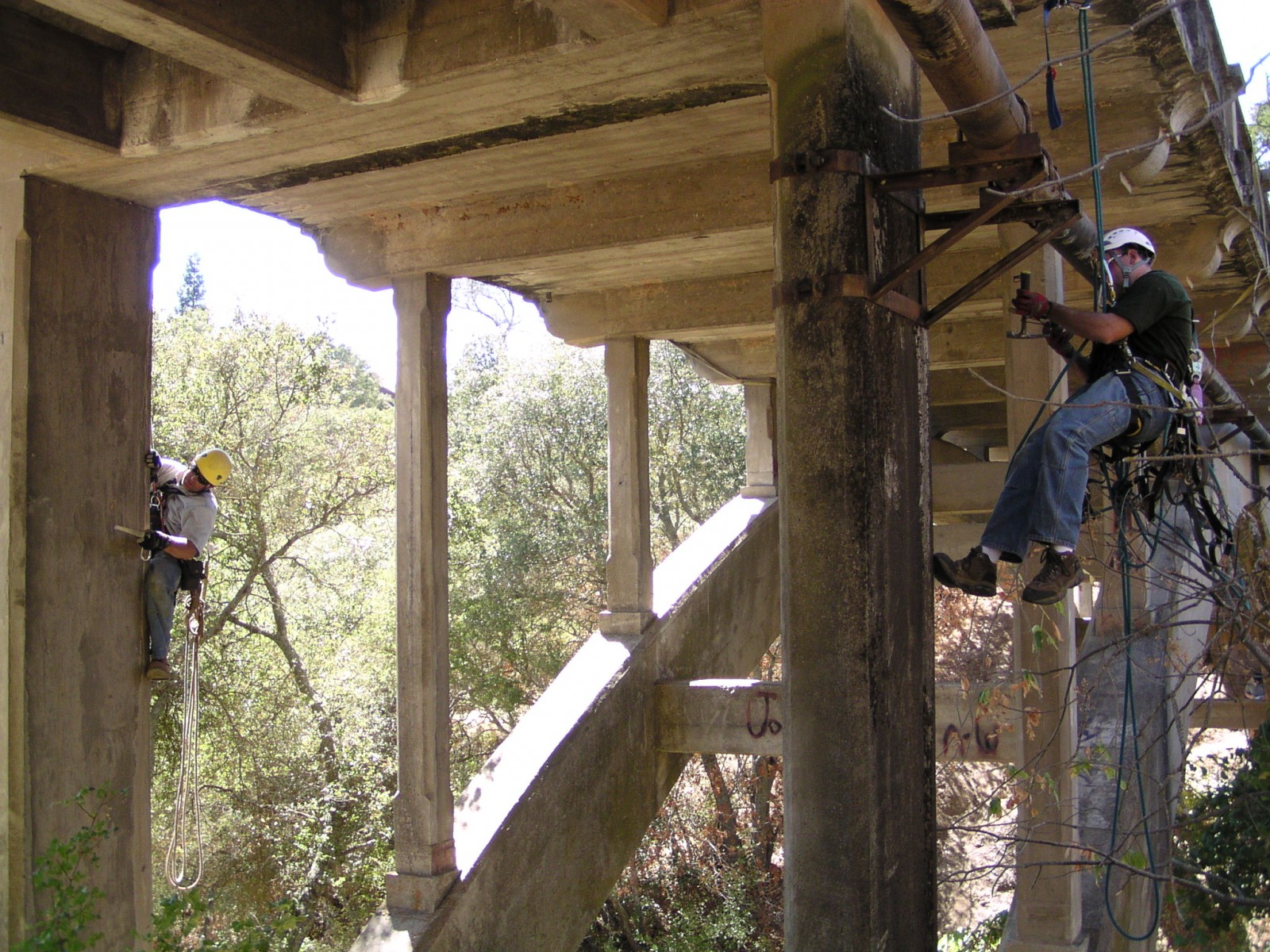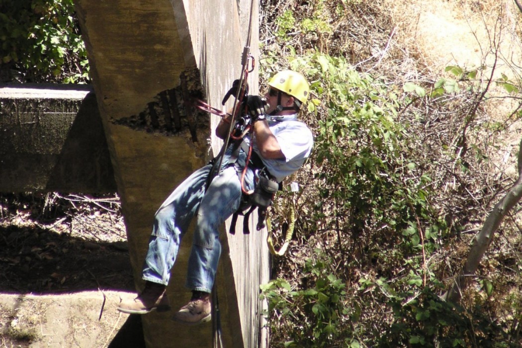 WJE set up a series of ropes and rappelling equipment so that the in-house Difficult Access Team could perform a comprehensive close-up inspection of the superstructure. The engineers documented the location and extent of concrete deterioration, recorded salient as-built geometric information for key members, and used nondestructive methods to confirm size and layout of embedded steel reinforcement. Concrete samples were taken from representative areas of the bridge and examined in WJE's laboratory to determine the quality, composition, and condition of the concrete. Using information from the survey, WJE prepared a report summarizing the condition of the bridge and provided conceptual concrete repair details.