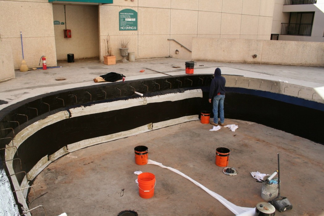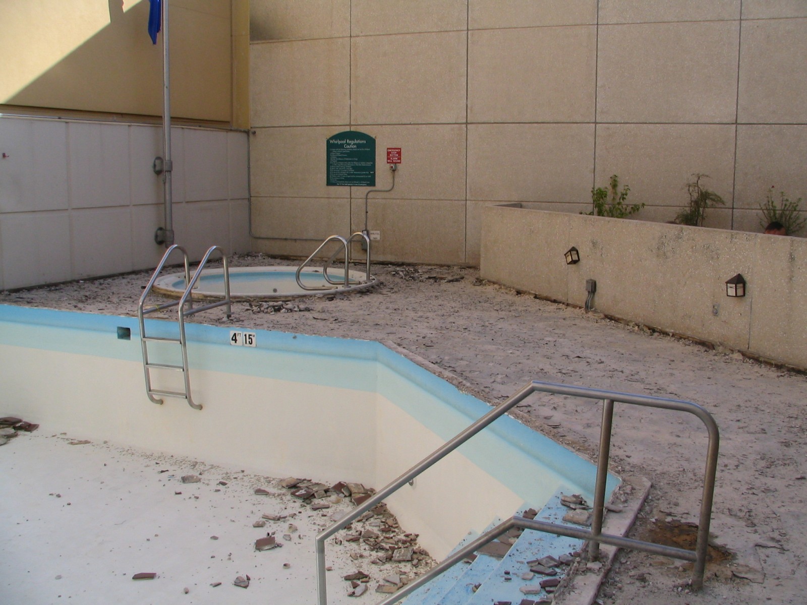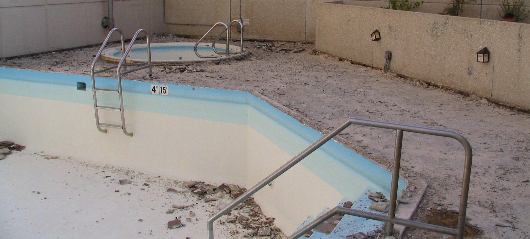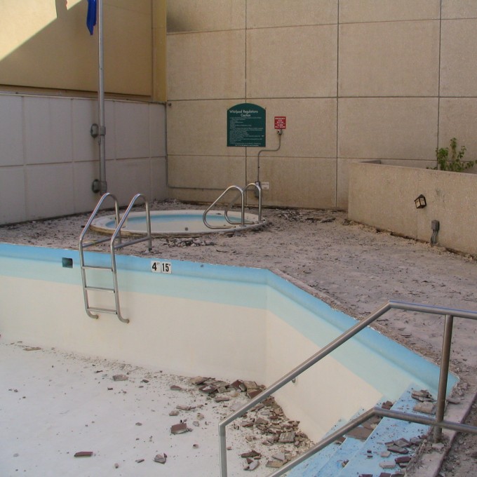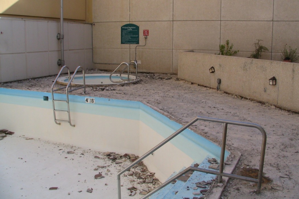 With information from the site investigation, WJE met with the client to discuss various solutions. In addition to the leakage and distress at the pool shell, leakage was occurring through the surrounding plaza surface, and the hotel management felt that the condition of the pool plaza was not aesthetically pleasing. The pool also lacked shade structures for swimmers. WJE worked with the client to design a comprehensive pool plaza renovation. The pool shell was completely removed and reconstructed. A redundant water containment system was designed with a complete waterproof enclosure for the new concrete pool shell. The existing spa adjacent to the pool was also replaced. Deteriorated plaza deck around the pool was removed and replaced, and new waterproofing and tile were installed over the entire plaza. The new design incorporated access hatches to provide entry for inspection of the enclosed space below the pool. A new pool mechanical system was also installed. The design was completed with improvements to pool amenities, including a new shade structure and bathroom renovations. Subsequent to design, WJE assisted the owner during bidding and construction administration for the project.