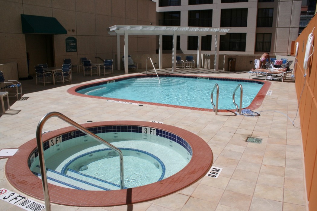 The Riverwalk Holiday Inn is located in downtown San Antonio, Texas, and contains an outdoor swimming pool and spa on the seventh floor of the building.